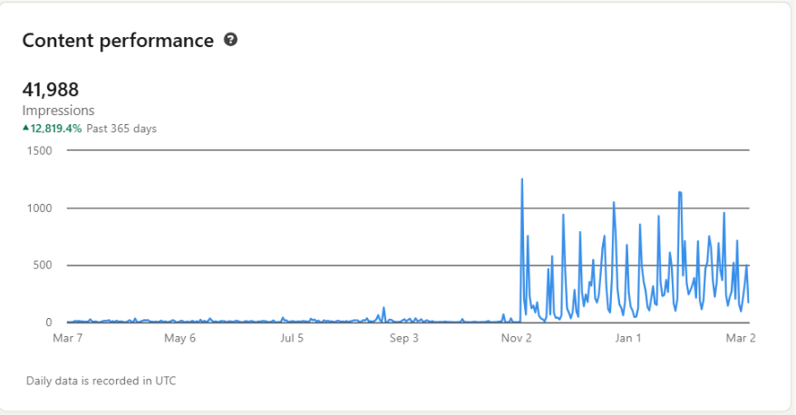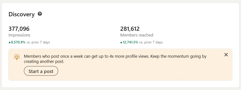 - 377,096 post impressions —> a surge of over 8,500% within one week